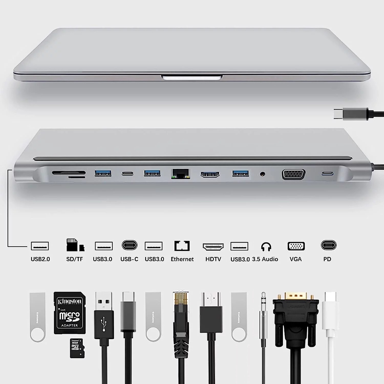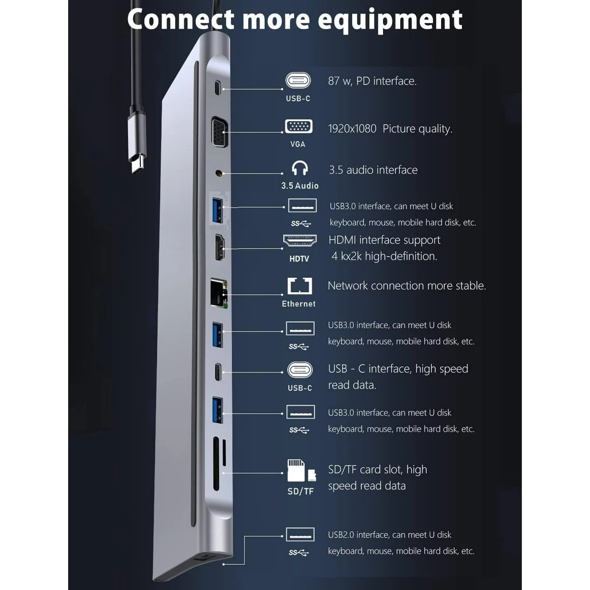 12 in 1 Type-c hub adapter with 2 x 4K high-grade multimedia interface port, 1 x VGA, 1 x RJ45 Ethernet, 3 x USB, 1 x USB C, 1 x USB C 87W PD charging, 1 x SD Card Reader, 1 x TF Card Reader, 1 x 3.5mm Audio Port,Connect up to 12 peripherals with a single cable connection.Turn any MacBook or USB C enabled laptop into a mobile workstation with a simple plug and play connection!